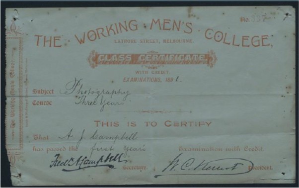 - Certificates from the Working Men's College, Melbourne for a photography course undertaken by A J Campbell (1891-1892)
